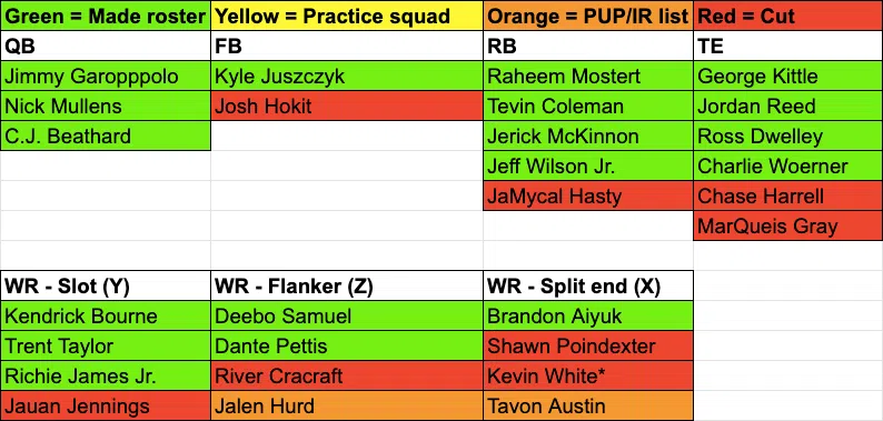 The questions here were whether the 49ers would keep four tight ends, four running backs and six wide receivers, which is exactly what they did. JaMycal Hasty had a stellar camp but was on the outside looking in due to the quality ahead of him and Jauan Jennings is a casualty of the fact that he plays the slot, where the 49ers have too much depth, and isn’t a return candidate. That extra spot could still be used for a player like Mohamed Sanu, though he’s also used frequently in the slot.
