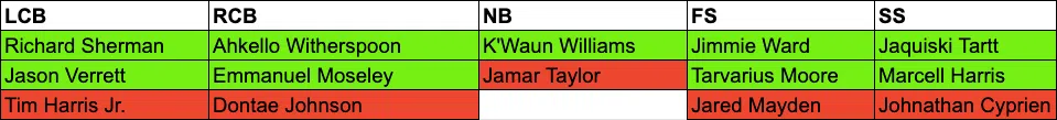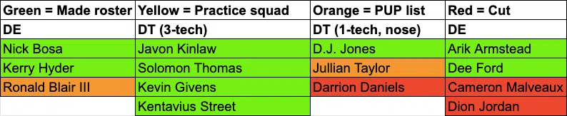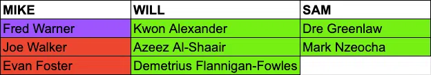 Here’s what the roster looks like visualized. Fred Warner is currently on the reserve/COVID-19 list and it may be that the open spot is for his return, but the team does not need six linebackers, and while he’s on the list, he does not count against the roster. He also gets a three-week practice return period, so there’s no need to keep a spot to get him back to practice. The team may elect to release a linebacker like Demetrius Flannigan-Fowles and be saving that spot for a free agent, or they’re trying something new by sticking with six, as a way of being overly cautious for when Warner does return.