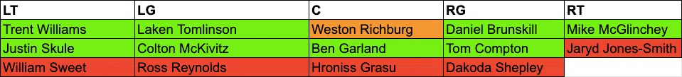 No surprises here. Hroniss Grasu did not appear to be a capable NFL center. If Ben Garland is still unavailable by Week 1, Daniel Brunskill will start there. It’s leaning that way at this point, giving the concern head coach Kyle Shanahan and general manager John Lynch expressed about Garland’s return timetable. Weston Richburg will be eligible to come off PUP starting in Week 6.