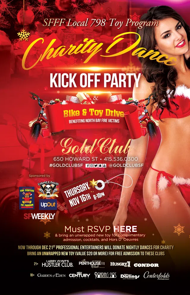 SFFF Local 798 Toy Program presents the Charity Dance Kick Off Party at the Gold Club in San Francisco on Thursday, November 16th from 8-10pm.
