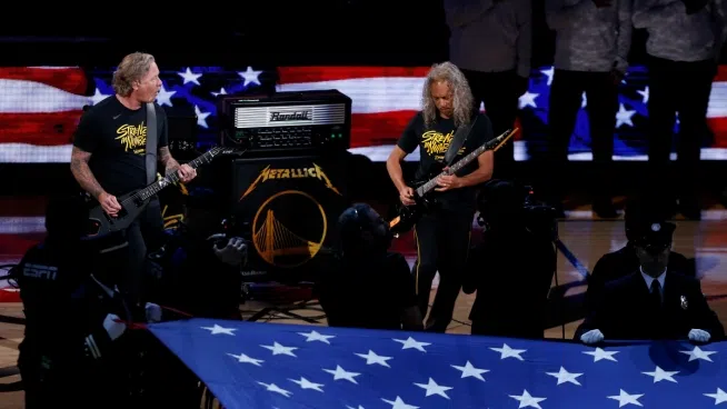 OAKLAND, CALIFORNIA – JUNE 05: The American national anthem is performed by Metallica prior to game Three of the 2019 NBA Finals between the Golden State Warriors and the Toronto Raptors at ORACLE Arena on June 05, 2019 in Oakland, California. NOTE TO USER: User expressly acknowledges and agrees that, by downloading and or using this photograph, User is consenting to the terms and conditions of the Getty Images License Agreement. (Photo by Lachlan Cunningham/Getty Images)
