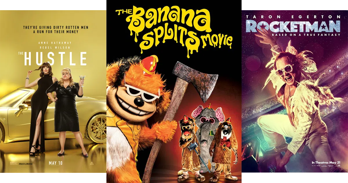 Hey kids! Remember the beloved kids program The Banana Splits? Dennis Willis reviews their bonkers (and violent) new direct-to-video movie! Anne Hathaway and Rebel Wilson star in The Hustle, the (almost too) faithful remake of Dirty Rotten Scoundrels. And if you missed them on the big screen, Godzilla and Rocketman are available for rental.
