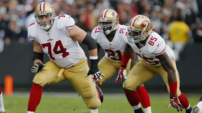 When Joe Staley conducted his final press conference on Tuesday afternoon, there were accolades and helmets and a healthy number of jerseys around him: at least a handful of framed jerseys of his wife, professional soccer player, Carrie Dew, some of Staley’s own, from high school to college to the NFL, one from Alex Smith, Justin Smith, Mike Iupati, a collector’s item from soccer player Gareth Bale’s Tottenham days, and hiding behind Staley, along with a Buffalo Bills helmet, a Frank Gore jersey.