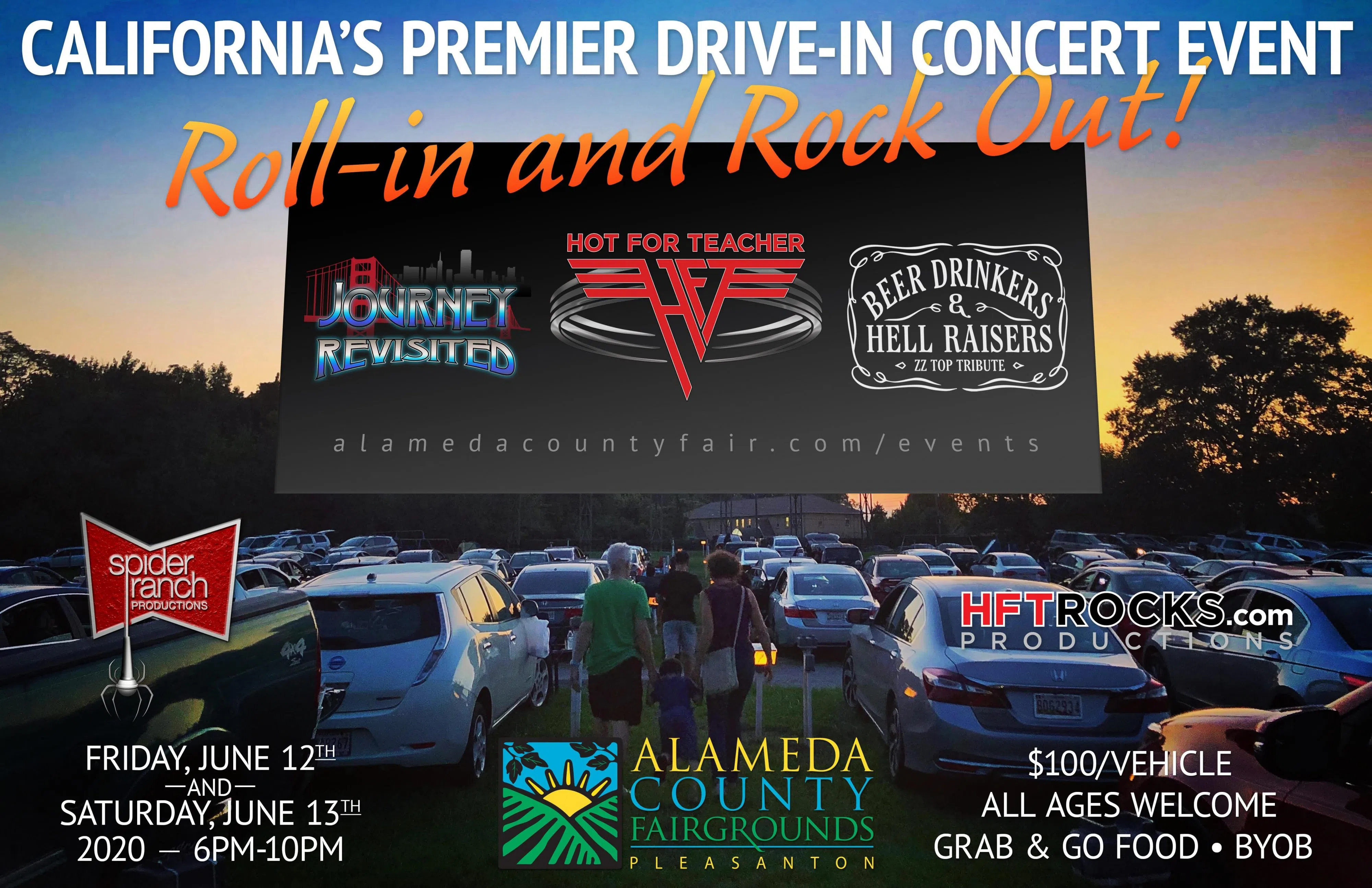 A “Roll-in and Rock Out” live drive-in concert will be held Friday, June 12th and Saturday, June 13th, 2020 at the Alameda County Fairgrounds at 4501 Pleasanton Avenue in Pleasanton, California.