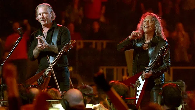 SAN FRANCISCO, CALIFORNIA – SEPTEMBER 06: James Hetfield (L) and Kirk Hammett of Metallica perform with the San Francisco Symphony during the “S&M2” concerts at the opening night at Chase Center on September 06, 2019 in San Francisco, California. (Photo by Tim Mosenfelder/Getty Images).