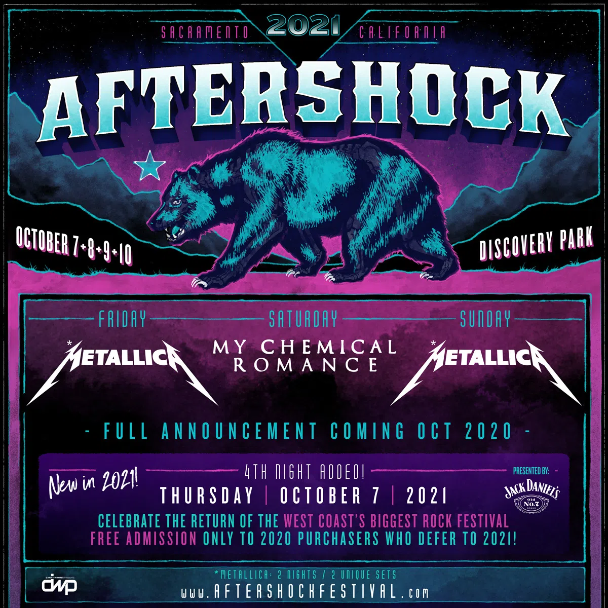 The DWP team is already working hard on Aftershock 2021—October 7, 8, 9 and 10—at Discovery Park in Sacramento, CA. Aftershock 2021 will be headlined by Metallica and My Chemical Romance, who were both confirmed for the sold-out 2020 event. Metallica will still perform their highly anticipated two unique sets over two nights. The complete Aftershock 2021 lineup will be announced this October.