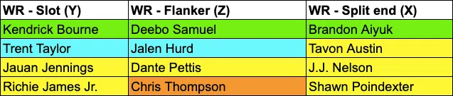 The position group is unquestionably the least experienced and weakest on the roster. Before the signing of Austin, a seven-year NFL veteran, and Nelson, a five-year NFL veteran, Trent Taylor, at age 26 and with three years of league experience, was the oldest player in the group. Kendrick Bourne, age 25, also has three years of experience.