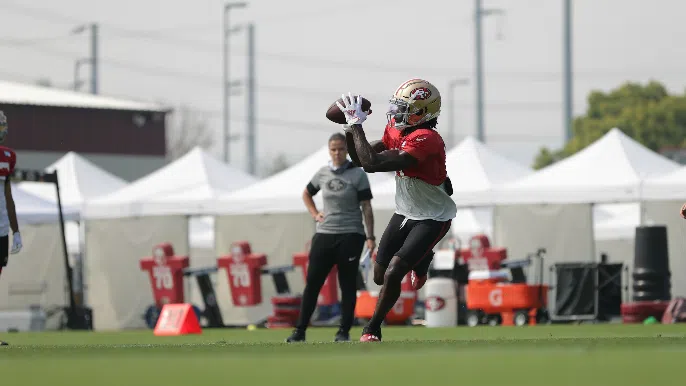 Brandon Aiyuk was the second injury. He looked brilliant throughout practice, consistently finding himself open and at least providing lanes for throws. Roughly midway through the sets of 11-on-11s, Jimmy Garoppolo launched a deep pass to Aiyuk, who pulled up slow, immediately heading to sideline, and stretched with trainers. It appeared to be a hamstring injury. He did not return to practice and like Ford, remained on the sidelines watching. Unlike Ford, he was mostly sitting or kneeling.