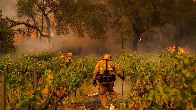 DEER PARK, CA – SEPTEMBER 27: Firefighters from the Sacramento Fire Department take part in a firing operation near a property along Crystal Springs Road as firefighters work to contain the Glass Fire in Napa County on Sunday, Sept. 27, 2020 in Deer Park, CA. (Kent Nishimura / Los Angeles Times via Getty Images).