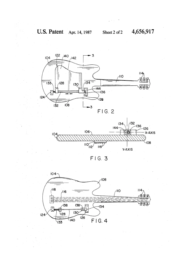 Left: Eddie Van Halen plays his custom Kramer Frankenstrat guitar at Cobo Arena during Van Halen’s “1984 Tour” on April 5, 1984, in Detroit, Michigan, Right: Hand drawing of the MUSICAL INSTRUMENT SUPPORT in a 1987 patent