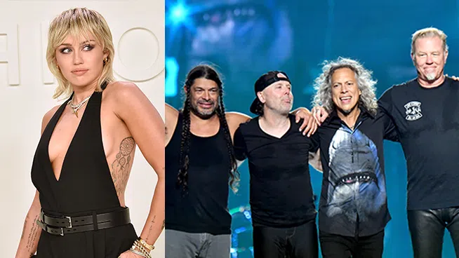 Left: Miley Cyrus attends a Los Angeles fashion show Right: Metallica perform on Lands End stage during the 2017 Outside Lands Music And Arts Festival in San Francisco