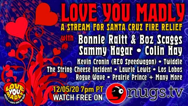 100% of all donations raised will go directly to the Fire Response Fund managed by partner organization Community Foundation Santa Cruz County (CFSCC). CFSCC has already granted over $600,000 from the fund, strategically distributed where they are most needed and will continue throughout the entire recovery process. Those inspired to donate to the fund before the stream can do so at http://cfscc.org/loveyoumadly.