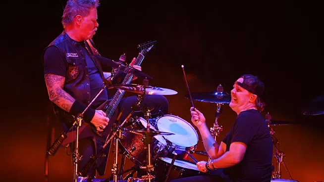 LAS VEGAS, NEVADA – NOVEMBER 26: Singer/guitarist James Hetfield (L) and drummer Lars Ulrich of Metallica perform during a stop of the band’s WorldWired Tour at T-Mobile Arena on November 26, 2018 in Las Vegas, Nevada. (Photo by Ethan Miller/Getty Images).