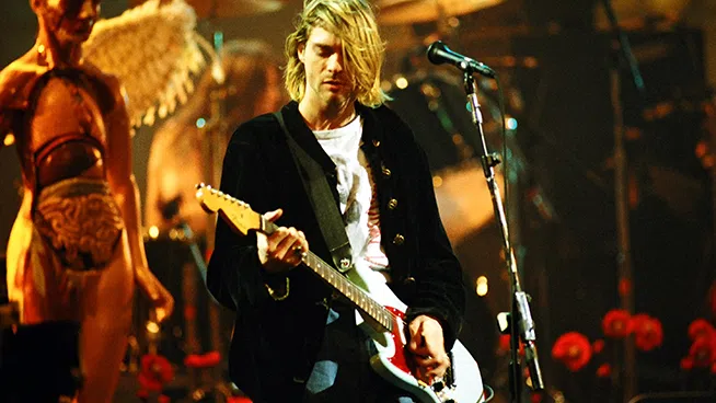 Kurt Cobain of Nirvana during MTV Live and Loud: Nirvana Performs Live – December 1993 at Pier 28 in Seattle, Washington, United States. (Photo by Jeff Kravitz/FilmMagic, Inc).