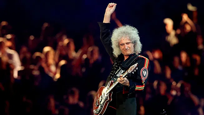 LONDON, ENGLAND – AUGUST 12: Brian May of Queen performs during the Closing Ceremony on Day 16 of the London 2012 Olympic Games at Olympic Stadium on August 12, 2012 in London, England. (Photo by Scott Heavey/Getty Images).