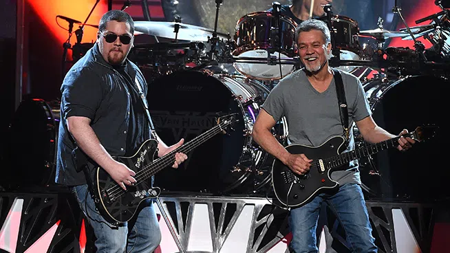 LAS VEGAS, NV – MAY 17: Musicians Wolfgang Van Halen (L) and Eddie Van Halen of Van Halen perform onstage during the 2015 Billboard Music Awards at MGM Grand Garden Arena on May 17, 2015 in Las Vegas, Nevada. (Photo by Ethan Miller/Getty Images).