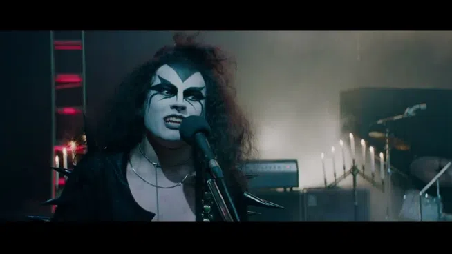 In a two-minute clip released Thursday, KISS performs “Rock and Roll All Nite” for a sold-out crowd while Bogart watches from backstage – with actor Casey Likes as Gene Simmons and Sam Harris as Paul Stanley.