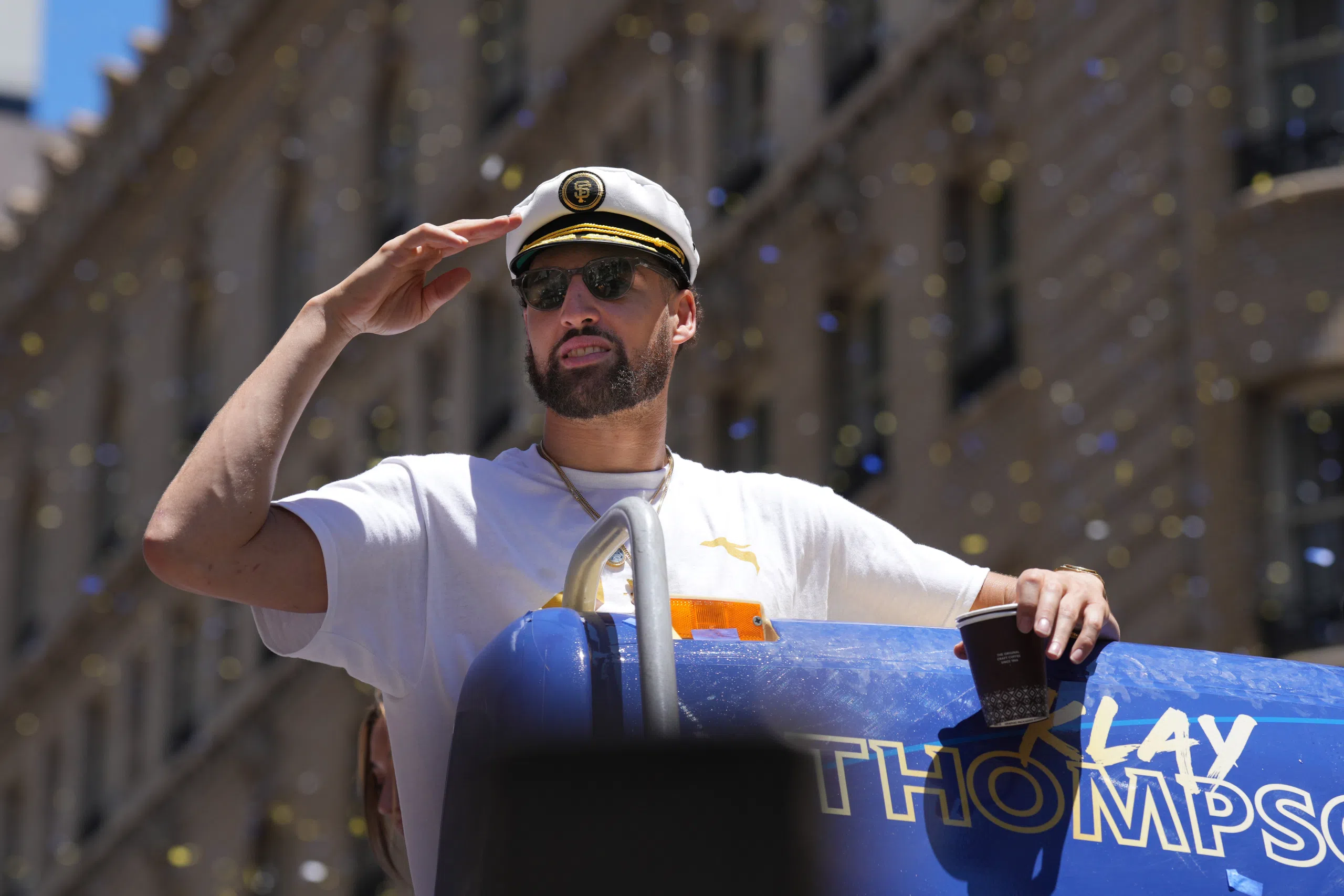 After arriving, Klay had replaced his championship hat with a captain’s hat, and was given the mic during the pre-parade ceremony to say a few words. He began by roasting Draymond Green for his “Thank you and f**k everybody else,” comment, before making Green and Stephen Curry absolutely erupt when recounting how the chef gave him a standing ovation at breakfast earlier in the day.