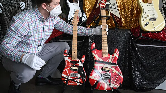 The Kramer CO176 guitar that Eddie Van Halen played in the video for “Hot For Teacher” has a new owner.