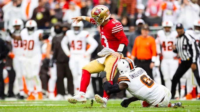 The 1981, 15-12 loss to the Browns was Montana’s worst start of the 1981 season, and was his 18th start as a 49er. For the record, that day he went 24-for-42 for 213 yards. Purdy’s line was uglier: 12-for-27, only 125 measly yards, one TD and one INT. Like Montana, he was sacked three times. And like Montana, his passer rating was in the 50s — but in funny twist, Purdy’s 55.3 outdid Joe’s 51.0 for all-time Cleveland low-lights.