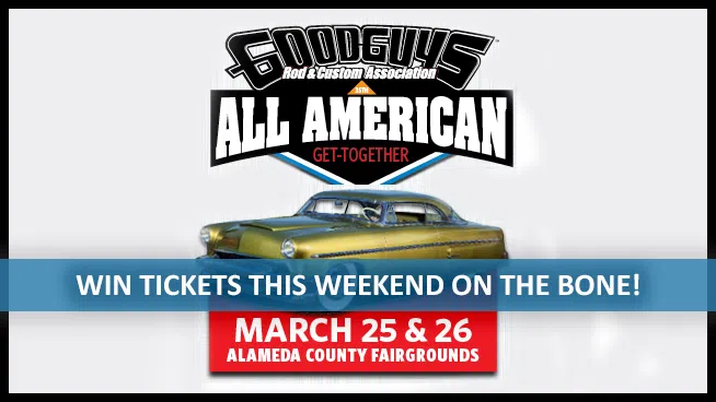 This weekend on The Bone, we’ll be spinning All-American 4-Plays and giving you a chance to win tickets to the Goodguys 35th All American Get-Together! Just tune in during the dates/hours below and listen for the cue-to-text. When you hear it, text the word to 1-888-303-BONE and you’ll get in the running to win two tickets to the Goodguys 35th All American Get-Together, happening March 25th & 26th at the Alameda County Fairgrounds in Pleasanton! Courtesy of Goodguys. Find the full rules here.
