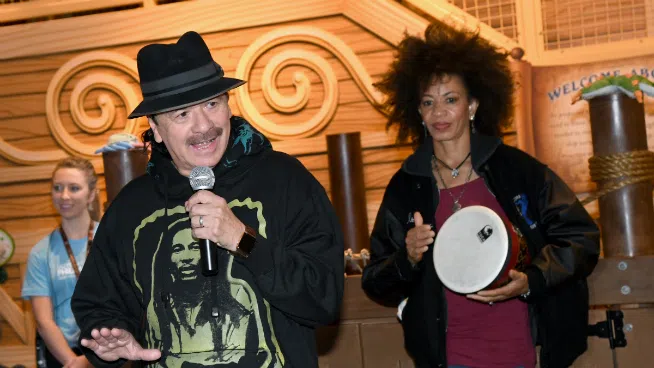 LAS VEGAS, NEVADA – OCTOBER 29: Recording artists Carlos Santana (L) and his wife Cindy Blackman Santana participate in the Las Vegas Philharmonic’s global edition of the orKIDStra music e...