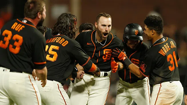 SAN FRANCISCO, CALIFORNIA – JUNE 26: Curt Casali #2 of the San Francisco Giants celebrates with teammates after hitting a walk-off RBI double in the bottom of the tenth inning against the Oaklan...