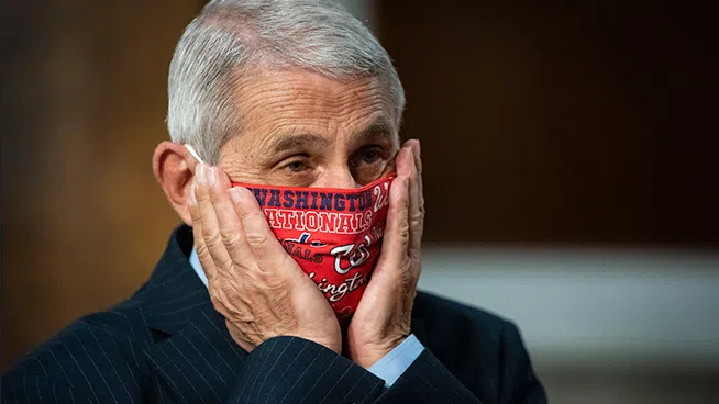 WASHINGTON, DC – JUNE 30: Anthony Fauci, director of the National Institute of Allergy and Infectious Diseases, adjusts a Washington Nationals protective mask while arriving to a Senate Health, ...