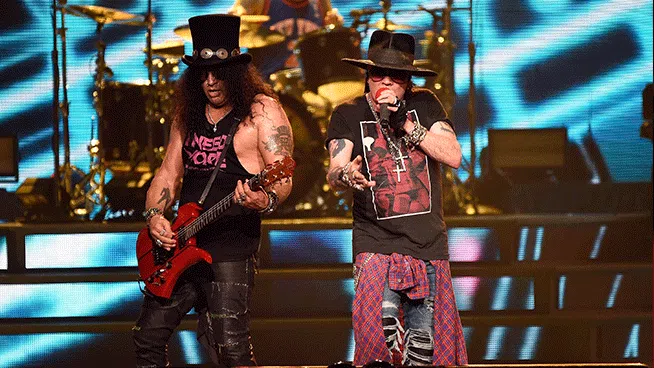 NEW YORK, NY – OCTOBER 11: Slash and Axl Rose of Guns N’ Roses perform onstage during the “Not In This Lifetime…” Tour at Madison Square Garden on October 11, 2017 in New...