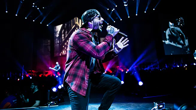 LONDON, UNITED KINGDOM – JANUARY 21: Vocalist M. Shadows of American hard rock group Avenged Sevenfold, photographed during a live performance at the O2 Arena in London, on January 21, 2017. (Ph...