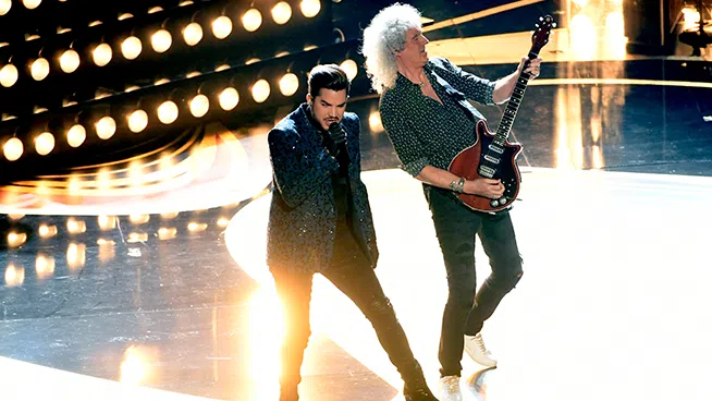 HOLLYWOOD, CALIFORNIA – FEBRUARY 24: (L-R) Adam Lambert and Brian May of Queen perform onstage during onstage during the 91st Annual Academy Awards at Dolby Theatre on February 24, 2019 in Holly...