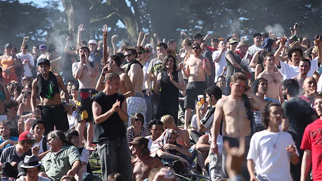 FILE – In this April 20, 2009, file photo, a large crowd cheers as the time reaches 4:20 p.m. on Hippie Hill in Golden Gate Park in San Francisco. Thursday, April 20, 2017, marks marijuana cultu...