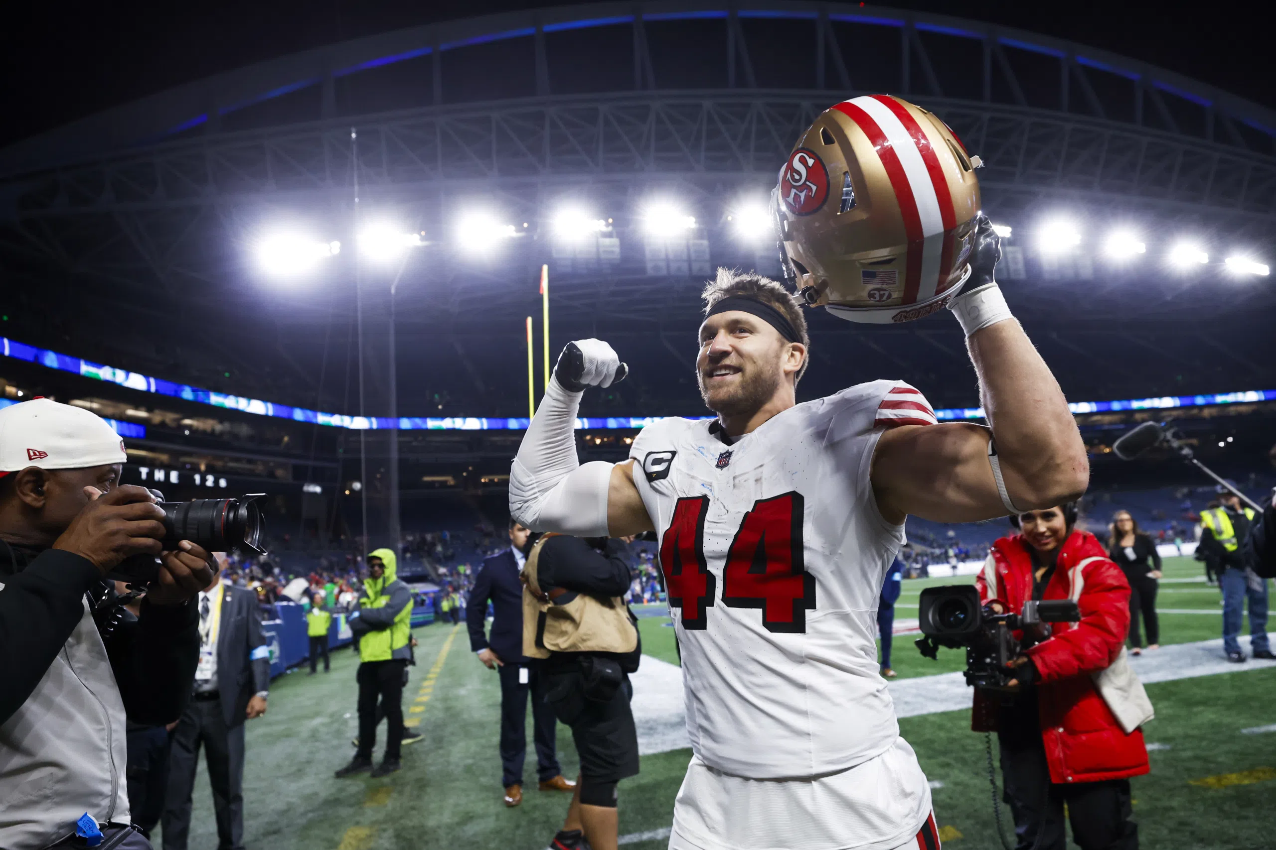 Oct 10, 2024; Seattle, Washington, USA; San Francisco 49ers fullback Kyle Juszczyk (44) celebrates while walking to the locker room following a victory against the Seattle Seahawks at Lumen Field. Man...