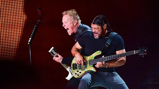 PHILADELPHIA, PA – MAY 12: (L-R) James Hetfield and Robert Trujillo of Metallica perform live on stage at Lincoln Financial Field on May 12, 2017 in Philadelphia, Pennsylvania. (Photo by Lisa La...