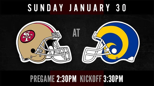 Tune in Sunday, January 30th as the Niners take on the Rams in the Playoffs! Pregame starts at 2:30, and kick-off is at 3:30. LET’S GO NINERS!