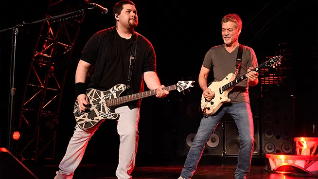 WANTAGH, NY – AUGUST 13: Eddie Van Halen (R) performs onstage at Nikon at Jones Beach Theater on August 13, 2015 in Wantagh, New York. (Photo by Kevin Mazur/Getty Images for Solters).Wolfgang Va...