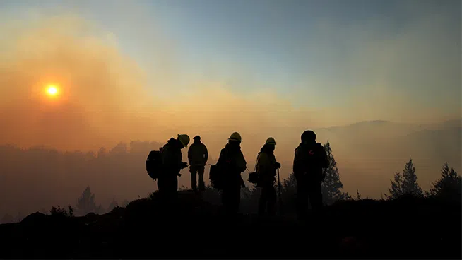 HEALDSBURG, CALIFORNIA – OCTOBER 29: Firefighters monitor the Kincade Fire on October 29, 2019 in Healdsburg, California. Fueled by high winds, the Kincade Fire has burned over 76,000 acres and ...