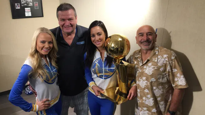 (Lamont & Tonelli, Warriors Dance Team members and the Larry O’Brien Trophy)The Golden State Warriors are the first NBA franchise to make 5 consecutive finals appearances since the Boston Ce...