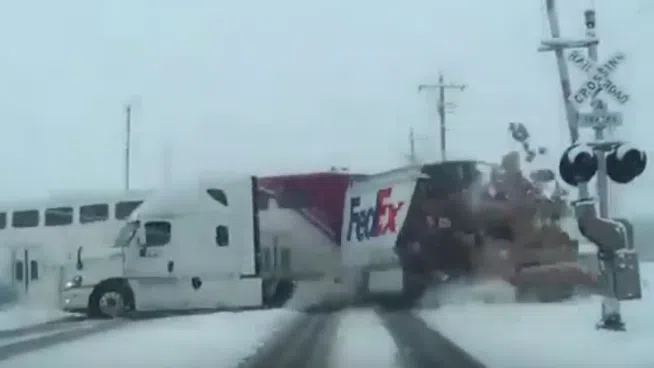A speeding commuter train slammed into a FedEx semi-trailer at a rail crossing in North Salt Lake, Utah, slicing it in two. Luckily no one was hurt.The crash took place last Saturday during a snow sto...